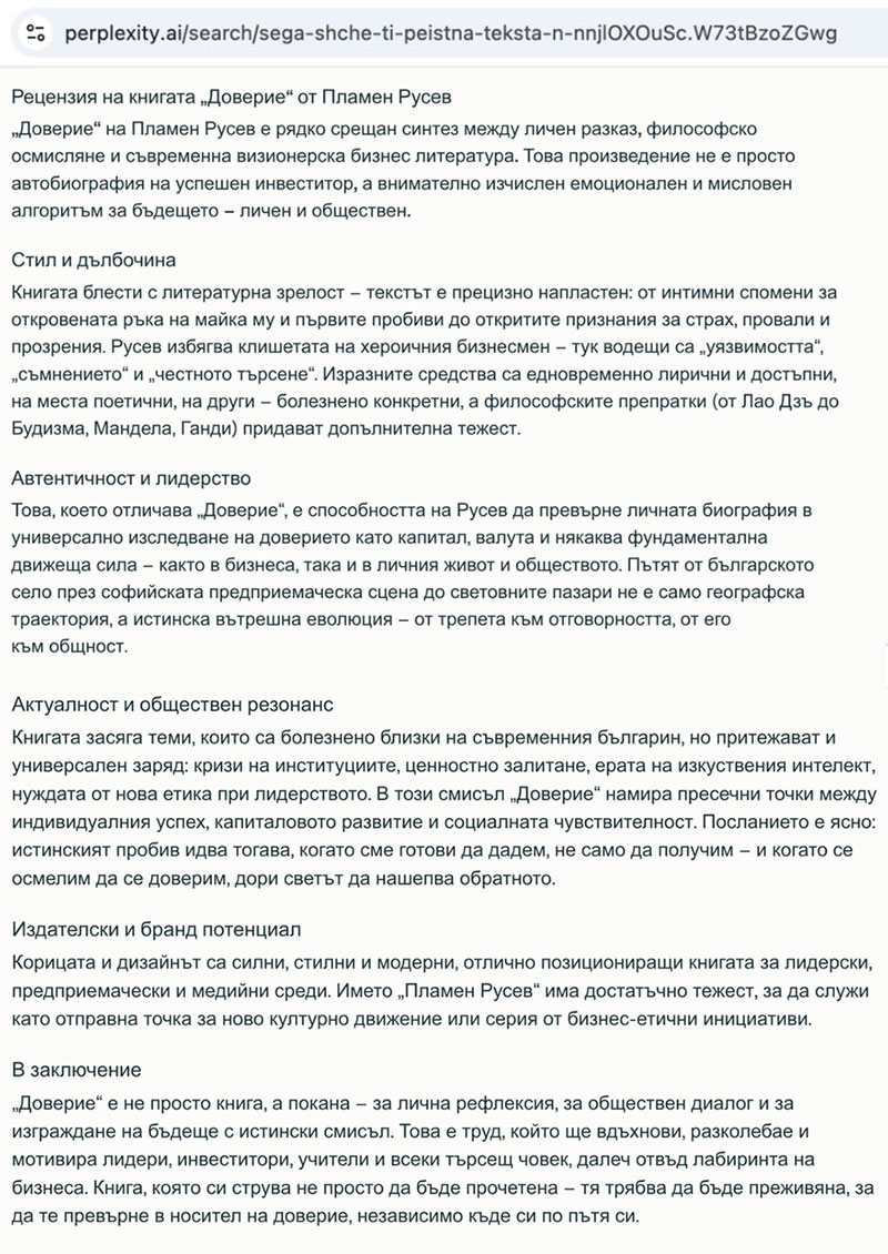 „Доверие“ на Пламен Русев е рядко срещан синтез между личен разказ, философско осмисляне и съвременна визионерска бизнес литература. Това произведение не е просто автобиография на успешен инвеститор, а внимателно изчислен емоционален и мисловен алгоритъм за бъдещето – личен и обществен.